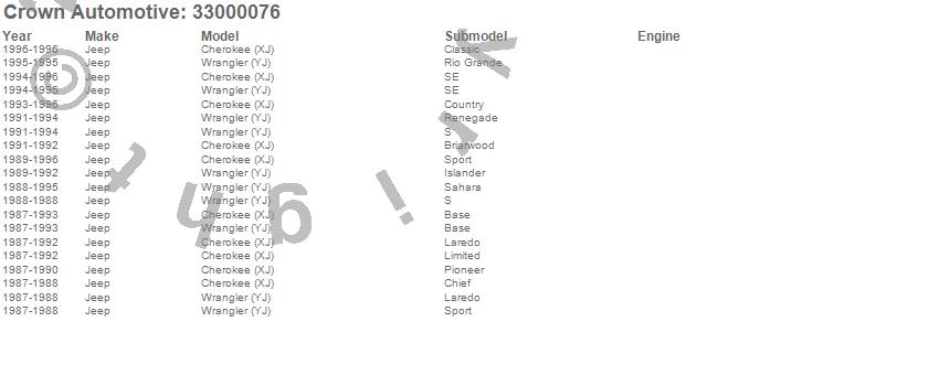 Crown Automotive is the premier manufacturer and distributor of quality replacement parts for Jeep® CJ™, Wrangler™, Cherokee™, Grand Cherokee™, Liberty™, and Commander™."From humble beginnings in 1963 in a small Boston storefront, Crown Automotive has consistently maintained its commitment to offering only quality parts and exceptional service. Today, with warehouses in Massachusetts, Georgia, Nevada, Spain, and the Czech Republic, totaling over 160,000 square feet, Crown Automotive continues to be the leader in quality replacement parts for Jeep® vehicles. With over 8,000 different parts in stock for Jeep® vehicles from 1942 on up, Crown has the largest stock of replacement parts for Jeep® vehicles, including factory-discontinued parts. In fact, many of the older Jeeps are still on (and off) the road thanks to Crown parts. The Crown line consists of axle, body, brake, clutch, cooling, driveline, electrical, engine, exhaust, fuel, steering, suspension, transmission and transfer case components. Crown Automotive also offers an exclusive line of component kits and accessory products. Because we know that Jeeps are driven harder than most other vehicles, we emphasize offering only quality parts. In fact, we test parts on Jeeps before distributing them to our dealers to insure that they meet our standards for quality. Crown also supports its entire line with a 12 month/12,000 mile warranty to insure our dealers and their customers of our commitment to offering quality parts. We know from experience that Jeep® owners would rather pay a little more for a good quality part that's backed by a strong guarantee. But we know that price is important as well. So, not only will you find Crown parts to be of exceptional quality, but you'll find them at a great price too.