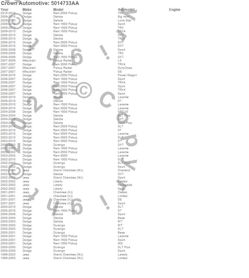 Cherokee (XJ), Dakota, Durango, Grand Cherokee (WJ), Liberty, Raider, Ram 1500, Ram 2500, Ram 3500, Dodge, Jeep, Mitsubishi, 2010, 2009, 2008, 2007, 2006, 2005, 2004, 2003 more…