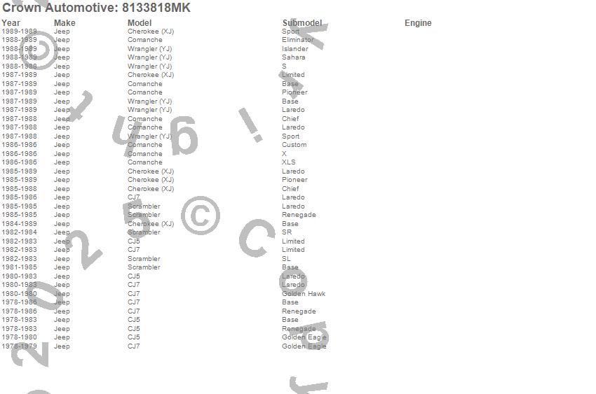 Crown Automotive is the premier manufacturer and distributor of quality replacement parts for Jeep® CJ™, Wrangler™, Cherokee™, Grand Cherokee™, Liberty™, and Commander™."From humble beginnings in 1963 in a small Boston storefront, Crown Automotive has consistently maintained its commitment to offering only quality parts and exceptional service. Today, with warehouses in Massachusetts, Georgia, Nevada, Spain, and the Czech Republic, totaling over 160,000 square feet, Crown Automotive continues to be the leader in quality replacement parts for Jeep® vehicles. With over 8,000 different parts in stock for Jeep® vehicles from 1942 on up, Crown has the largest stock of replacement parts for Jeep® vehicles, including factory-discontinued parts. In fact, many of the older Jeeps are still on (and off) the road thanks to Crown parts. The Crown line consists of axle, body, brake, clutch, cooling, driveline, electrical, engine, exhaust, fuel, steering, suspension, transmission and transfer case components. Crown Automotive also offers an exclusive line of component kits and accessory products. Because we know that Jeeps are driven harder than most other vehicles, we emphasize offering only quality parts. In fact, we test parts on Jeeps before distributing them to our dealers to insure that they meet our standards for quality. Crown also supports its entire line with a 12 month/12,000 mile warranty to insure our dealers and their customers of our commitment to offering quality parts. We know from experience that Jeep® owners would rather pay a little more for a good quality part that's backed by a strong guarantee. But we know that price is important as well. So, not only will you find Crown parts to be of exceptional quality, but you'll find them at a great price too.