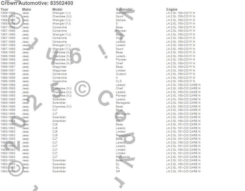 Crown Automotive is the premier manufacturer and distributor of quality replacement parts for Jeep® CJ™, Wrangler™, Cherokee™, Grand Cherokee™, Liberty™, and Commander™."From humble beginnings in 1963 in a small Boston storefront, Crown Automotive has consistently maintained its commitment to offering only quality parts and exceptional service. Today, with warehouses in Massachusetts, Georgia, Nevada, Spain, and the Czech Republic, totaling over 160,000 square feet, Crown Automotive continues to be the leader in quality replacement parts for Jeep® vehicles. With over 8,000 different parts in stock for Jeep® vehicles from 1942 on up, Crown has the largest stock of replacement parts for Jeep® vehicles, including factory-discontinued parts. In fact, many of the older Jeeps are still on (and off) the road thanks to Crown parts. The Crown line consists of axle, body, brake, clutch, cooling, driveline, electrical, engine, exhaust, fuel, steering, suspension, transmission and transfer case components. Crown Automotive also offers an exclusive line of component kits and accessory products. Because we know that Jeeps are driven harder than most other vehicles, we emphasize offering only quality parts. In fact, we test parts on Jeeps before distributing them to our dealers to insure that they meet our standards for quality. Crown also supports its entire line with a 12 month/12,000 mile warranty to insure our dealers and their customers of our commitment to offering quality parts. We know from experience that Jeep® owners would rather pay a little more for a good quality part that's backed by a strong guarantee. But we know that price is important as well. So, not only will you find Crown parts to be of exceptional quality, but you'll find them at a great price too.