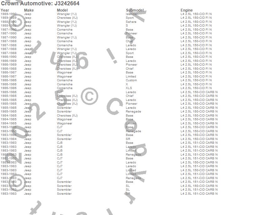 Crown Automotive is the premier manufacturer and distributor of quality replacement parts for Jeep® CJ™, Wrangler™, Cherokee™, Grand Cherokee™, Liberty™, and Commander™."From humble beginnings in 1963 in a small Boston storefront, Crown Automotive has consistently maintained its commitment to offering only quality parts and exceptional service. Today, with warehouses in Massachusetts, Georgia, Nevada, Spain, and the Czech Republic, totaling over 160,000 square feet, Crown Automotive continues to be the leader in quality replacement parts for Jeep® vehicles. With over 8,000 different parts in stock for Jeep® vehicles from 1942 on up, Crown has the largest stock of replacement parts for Jeep® vehicles, including factory-discontinued parts. In fact, many of the older Jeeps are still on (and off) the road thanks to Crown parts. The Crown line consists of axle, body, brake, clutch, cooling, driveline, electrical, engine, exhaust, fuel, steering, suspension, transmission and transfer case components. Crown Automotive also offers an exclusive line of component kits and accessory products. Because we know that Jeeps are driven harder than most other vehicles, we emphasize offering only quality parts. In fact, we test parts on Jeeps before distributing them to our dealers to insure that they meet our standards for quality. Crown also supports its entire line with a 12 month/12,000 mile warranty to insure our dealers and their customers of our commitment to offering quality parts. We know from experience that Jeep® owners would rather pay a little more for a good quality part that's backed by a strong guarantee. But we know that price is important as well. So, not only will you find Crown parts to be of exceptional quality, but you'll find them at a great price too.