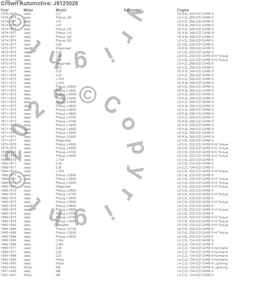 CJ-2A, CJ-3A, CJ-3B, CJ3, CJ5, CJ5A, CJ6, CJ6A, CJ7, Gladiator, J-100, J-2500, J-2600, J-2700, J-2800, J-3500, J-3600, J-3700, J-3800, J-4500 more…