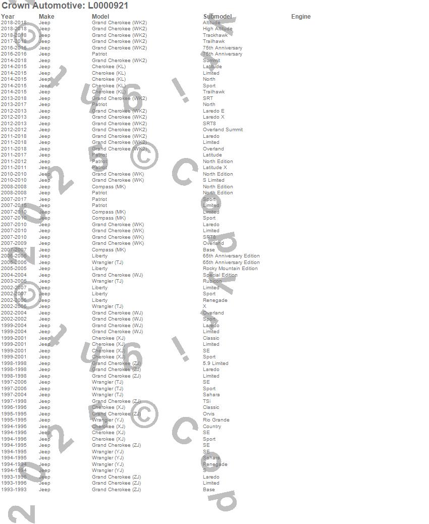 Cherokee (KL), Cherokee (XJ), Compass, Grand Cherokee (WJ), Grand Cherokee (WK), Grand Cherokee (WK2), Grand Cherokee (ZJ), Liberty, Patriot, Wrangler (TJ), Wrangler (YJ), Jeep, 2015, 2014, 2013, 2012, 2011, 2010, 2009, 2008 more…