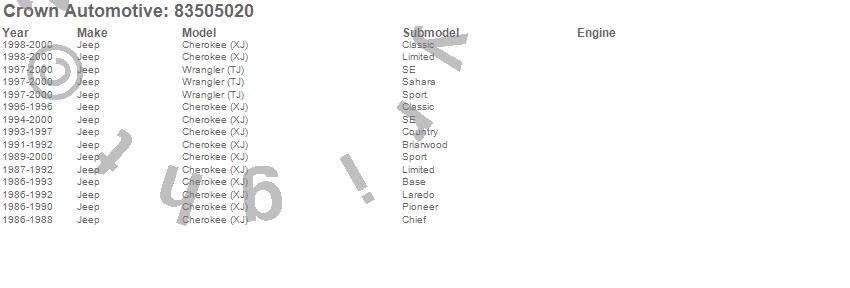Cherokee (XJ), Wrangler (TJ), Jeep, 2000, 1999, 1998, 1997, 1996, 1995, 1994, 1993, 1992, 1991, 1990, 1989, 1988, 1987, 1986 more…