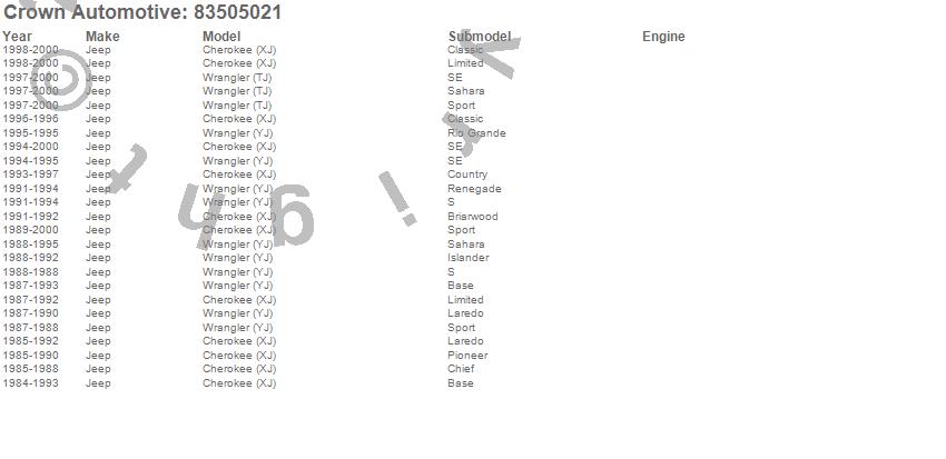 Cherokee (XJ), Wrangler (TJ), Wrangler (YJ), Jeep, 2000, 1999, 1998, 1997, 1996, 1995, 1994, 1993, 1992, 1991, 1990, 1989, 1988, 1987, 1986, 1985 more…