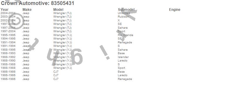 Crown Automotive is the premier manufacturer and distributor of quality replacement parts for Jeep® CJ™, Wrangler™, Cherokee™, Grand Cherokee™, Liberty™, and Commander™."From humble beginnings in 1963 in a small Boston storefront, Crown Automotive has consistently maintained its commitment to offering only quality parts and exceptional service. Today, with warehouses in Massachusetts, Georgia, Nevada, Spain, and the Czech Republic, totaling over 160,000 square feet, Crown Automotive continues to be the leader in quality replacement parts for Jeep® vehicles. With over 8,000 different parts in stock for Jeep® vehicles from 1942 on up, Crown has the largest stock of replacement parts for Jeep® vehicles, including factory-discontinued parts. In fact, many of the older Jeeps are still on (and off) the road thanks to Crown parts. The Crown line consists of axle, body, brake, clutch, cooling, driveline, electrical, engine, exhaust, fuel, steering, suspension, transmission and transfer case components. Crown Automotive also offers an exclusive line of component kits and accessory products. Because we know that Jeeps are driven harder than most other vehicles, we emphasize offering only quality parts. In fact, we test parts on Jeeps before distributing them to our dealers to insure that they meet our standards for quality. Crown also supports its entire line with a 12 month/12,000 mile warranty to insure our dealers and their customers of our commitment to offering quality parts. We know from experience that Jeep® owners would rather pay a little more for a good quality part that's backed by a strong guarantee. But we know that price is important as well. So, not only will you find Crown parts to be of exceptional quality, but you'll find them at a great price too.