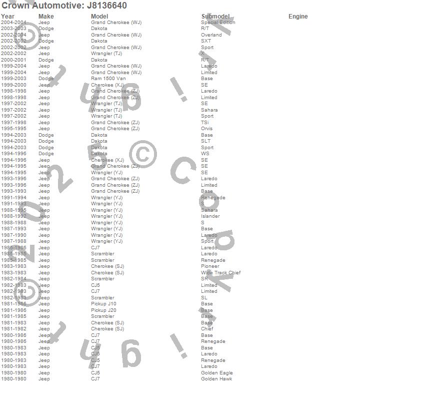 Cherokee (SJ), Cherokee (XJ), CJ5, CJ7, Dakota, Grand Cherokee (WJ), Grand Cherokee (ZJ), J10, J20, Ram 1500 Van, Scrambler, Wrangler (TJ), Wrangler (YJ), Dodge, Jeep, 2004, 2003, 2002, 2001, 2000 more…