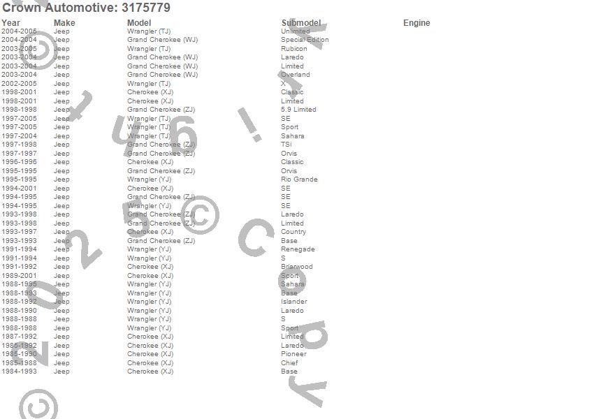 Crown Automotive is the premier manufacturer and distributor of quality replacement parts for Jeep® CJ™, Wrangler™, Cherokee™, Grand Cherokee™, Liberty™, and Commander™."From humble beginnings in 1963 in a small Boston storefront, Crown Automotive has consistently maintained its commitment to offering only quality parts and exceptional service. Today, with warehouses in Massachusetts, Georgia, Nevada, Spain, and the Czech Republic, totaling over 160,000 square feet, Crown Automotive continues to be the leader in quality replacement parts for Jeep® vehicles. With over 8,000 different parts in stock for Jeep® vehicles from 1942 on up, Crown has the largest stock of replacement parts for Jeep® vehicles, including factory-discontinued parts. In fact, many of the older Jeeps are still on (and off) the road thanks to Crown parts. The Crown line consists of axle, body, brake, clutch, cooling, driveline, electrical, engine, exhaust, fuel, steering, suspension, transmission and transfer case components. Crown Automotive also offers an exclusive line of component kits and accessory products. Because we know that Jeeps are driven harder than most other vehicles, we emphasize offering only quality parts. In fact, we test parts on Jeeps before distributing them to our dealers to insure that they meet our standards for quality. Crown also supports its entire line with a 12 month/12,000 mile warranty to insure our dealers and their customers of our commitment to offering quality parts. We know from experience that Jeep® owners would rather pay a little more for a good quality part that's backed by a strong guarantee. But we know that price is important as well. So, not only will you find Crown parts to be of exceptional quality, but you'll find them at a great price too.