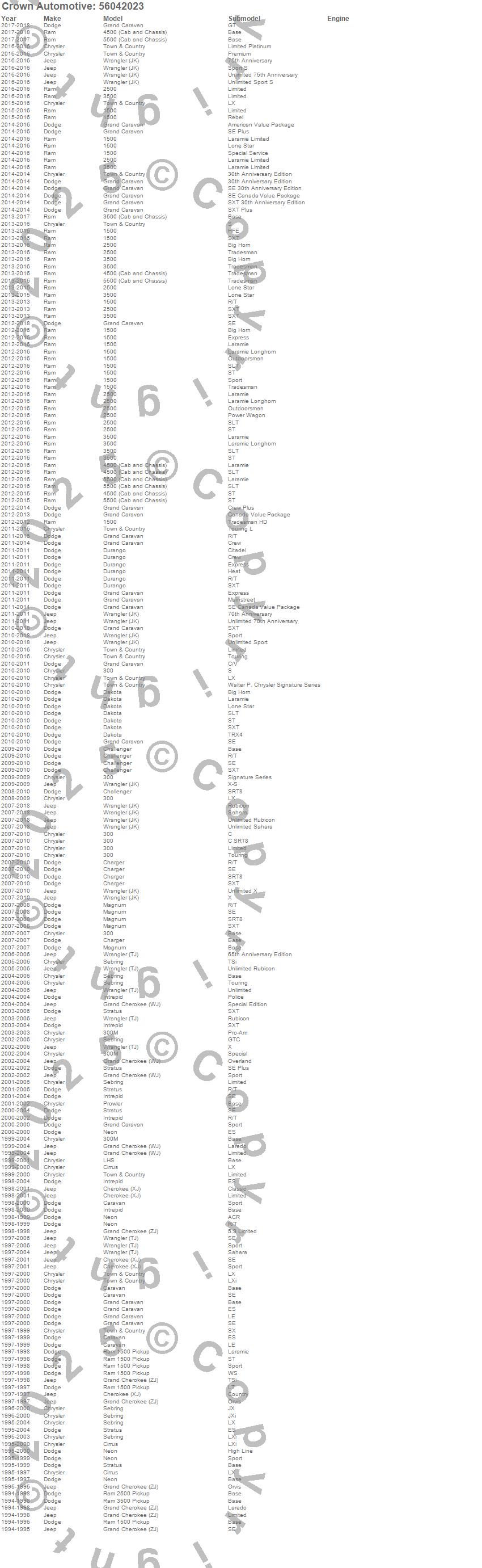 1500, 2500, 300, 300M, 3500, Caravan, Challenger, Charger, Cherokee (XJ), Cirrus, Dakota, Grand Caravan, Grand Cherokee (WJ), Grand Cherokee (ZJ), Intrepid, LHS, Magnum, Neon, Prowler, Raider more…