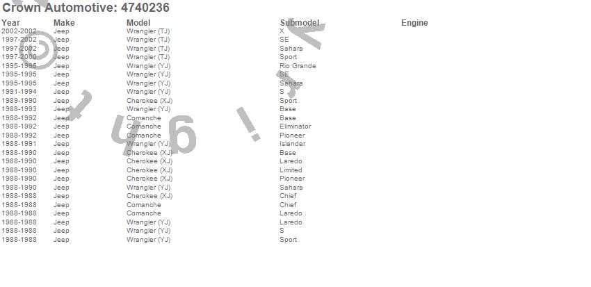Crown Automotive is the premier manufacturer and distributor of quality replacement parts for Jeep® CJ™, Wrangler™, Cherokee™, Grand Cherokee™, Liberty™, and Commander™."From humble beginnings in 1963 in a small Boston storefront, Crown Automotive has consistently maintained its commitment to offering only quality parts and exceptional service. Today, with warehouses in Massachusetts, Georgia, Nevada, Spain, and the Czech Republic, totaling over 160,000 square feet, Crown Automotive continues to be the leader in quality replacement parts for Jeep® vehicles. With over 8,000 different parts in stock for Jeep® vehicles from 1942 on up, Crown has the largest stock of replacement parts for Jeep® vehicles, including factory-discontinued parts. In fact, many of the older Jeeps are still on (and off) the road thanks to Crown parts. The Crown line consists of axle, body, brake, clutch, cooling, driveline, electrical, engine, exhaust, fuel, steering, suspension, transmission and transfer case components. Crown Automotive also offers an exclusive line of component kits and accessory products. Because we know that Jeeps are driven harder than most other vehicles, we emphasize offering only quality parts. In fact, we test parts on Jeeps before distributing them to our dealers to insure that they meet our standards for quality. Crown also supports its entire line with a 12 month/12,000 mile warranty to insure our dealers and their customers of our commitment to offering quality parts. We know from experience that Jeep® owners would rather pay a little more for a good quality part that's backed by a strong guarantee. But we know that price is important as well. So, not only will you find Crown parts to be of exceptional quality, but you'll find them at a great price too.