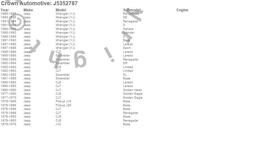 Crown Automotive is the premier manufacturer and distributor of quality replacement parts for Jeep® CJ™, Wrangler™, Cherokee™, Grand Cherokee™, Liberty™, and Commander™."From humble beginnings in 1963 in a small Boston storefront, Crown Automotive has consistently maintained its commitment to offering only quality parts and exceptional service. Today, with warehouses in Massachusetts, Georgia, Nevada, Spain, and the Czech Republic, totaling over 160,000 square feet, Crown Automotive continues to be the leader in quality replacement parts for Jeep® vehicles. With over 8,000 different parts in stock for Jeep® vehicles from 1942 on up, Crown has the largest stock of replacement parts for Jeep® vehicles, including factory-discontinued parts. In fact, many of the older Jeeps are still on (and off) the road thanks to Crown parts. The Crown line consists of axle, body, brake, clutch, cooling, driveline, electrical, engine, exhaust, fuel, steering, suspension, transmission and transfer case components. Crown Automotive also offers an exclusive line of component kits and accessory products. Because we know that Jeeps are driven harder than most other vehicles, we emphasize offering only quality parts. In fact, we test parts on Jeeps before distributing them to our dealers to insure that they meet our standards for quality. Crown also supports its entire line with a 12 month/12,000 mile warranty to insure our dealers and their customers of our commitment to offering quality parts. We know from experience that Jeep® owners would rather pay a little more for a good quality part that's backed by a strong guarantee. But we know that price is important as well. So, not only will you find Crown parts to be of exceptional quality, but you'll find them at a great price too.