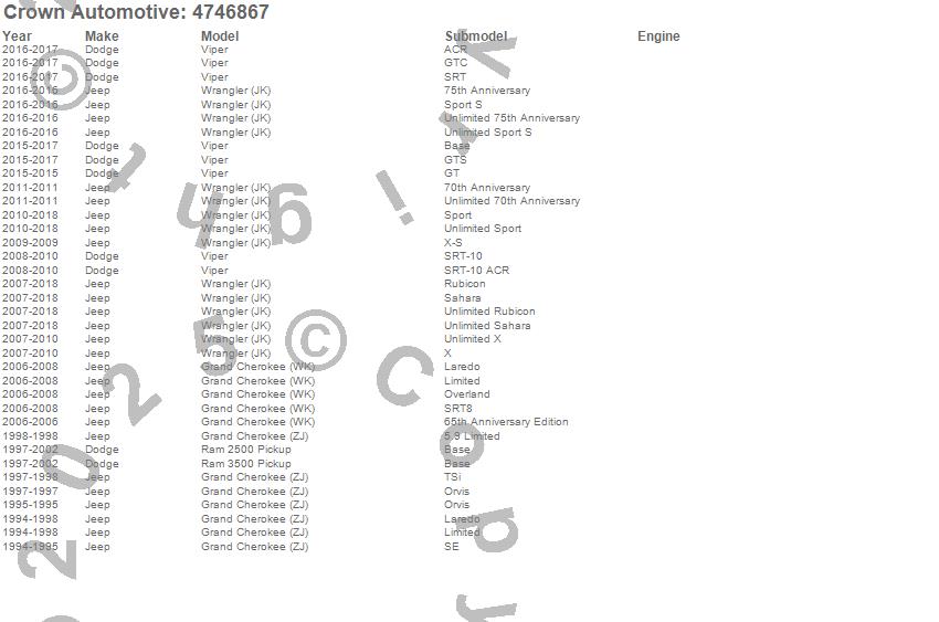 Ram 2500, Ram 3500, Viper, Wrangler (JK), Dodge, Jeep, 2015, 2014, 2013, 2012, 2011, 2010, 2009, 2008, 2007, 2002, 2001, 2000, 1999, 1998 more…