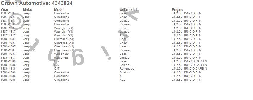 Crown Automotive is the premier manufacturer and distributor of quality replacement parts for Jeep® CJ™, Wrangler™, Cherokee™, Grand Cherokee™, Liberty™, and Commander™."From humble beginnings in 1963 in a small Boston storefront, Crown Automotive has consistently maintained its commitment to offering only quality parts and exceptional service. Today, with warehouses in Massachusetts, Georgia, Nevada, Spain, and the Czech Republic, totaling over 160,000 square feet, Crown Automotive continues to be the leader in quality replacement parts for Jeep® vehicles. With over 8,000 different parts in stock for Jeep® vehicles from 1942 on up, Crown has the largest stock of replacement parts for Jeep® vehicles, including factory-discontinued parts. In fact, many of the older Jeeps are still on (and off) the road thanks to Crown parts. The Crown line consists of axle, body, brake, clutch, cooling, driveline, electrical, engine, exhaust, fuel, steering, suspension, transmission and transfer case components. Crown Automotive also offers an exclusive line of component kits and accessory products. Because we know that Jeeps are driven harder than most other vehicles, we emphasize offering only quality parts. In fact, we test parts on Jeeps before distributing them to our dealers to insure that they meet our standards for quality. Crown also supports its entire line with a 12 month/12,000 mile warranty to insure our dealers and their customers of our commitment to offering quality parts. We know from experience that Jeep® owners would rather pay a little more for a good quality part that's backed by a strong guarantee. But we know that price is important as well. So, not only will you find Crown parts to be of exceptional quality, but you'll find them at a great price too.