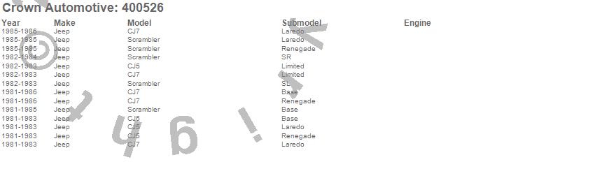Crown Automotive is the premier manufacturer and distributor of quality replacement parts for Jeep® CJ™, Wrangler™, Cherokee™, Grand Cherokee™, Liberty™, and Commander™."From humble beginnings in 1963 in a small Boston storefront, Crown Automotive has consistently maintained its commitment to offering only quality parts and exceptional service. Today, with warehouses in Massachusetts, Georgia, Nevada, Spain, and the Czech Republic, totaling over 160,000 square feet, Crown Automotive continues to be the leader in quality replacement parts for Jeep® vehicles. With over 8,000 different parts in stock for Jeep® vehicles from 1942 on up, Crown has the largest stock of replacement parts for Jeep® vehicles, including factory-discontinued parts. In fact, many of the older Jeeps are still on (and off) the road thanks to Crown parts. The Crown line consists of axle, body, brake, clutch, cooling, driveline, electrical, engine, exhaust, fuel, steering, suspension, transmission and transfer case components. Crown Automotive also offers an exclusive line of component kits and accessory products. Because we know that Jeeps are driven harder than most other vehicles, we emphasize offering only quality parts. In fact, we test parts on Jeeps before distributing them to our dealers to insure that they meet our standards for quality. Crown also supports its entire line with a 12 month/12,000 mile warranty to insure our dealers and their customers of our commitment to offering quality parts. We know from experience that Jeep® owners would rather pay a little more for a good quality part that's backed by a strong guarantee. But we know that price is important as well. So, not only will you find Crown parts to be of exceptional quality, but you'll find them at a great price too.