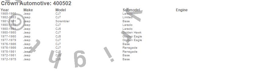Crown Automotive is the premier manufacturer and distributor of quality replacement parts for Jeep® CJ™, Wrangler™, Cherokee™, Grand Cherokee™, Liberty™, and Commander™."From humble beginnings in 1963 in a small Boston storefront, Crown Automotive has consistently maintained its commitment to offering only quality parts and exceptional service. Today, with warehouses in Massachusetts, Georgia, Nevada, Spain, and the Czech Republic, totaling over 160,000 square feet, Crown Automotive continues to be the leader in quality replacement parts for Jeep® vehicles. With over 8,000 different parts in stock for Jeep® vehicles from 1942 on up, Crown has the largest stock of replacement parts for Jeep® vehicles, including factory-discontinued parts. In fact, many of the older Jeeps are still on (and off) the road thanks to Crown parts. The Crown line consists of axle, body, brake, clutch, cooling, driveline, electrical, engine, exhaust, fuel, steering, suspension, transmission and transfer case components. Crown Automotive also offers an exclusive line of component kits and accessory products. Because we know that Jeeps are driven harder than most other vehicles, we emphasize offering only quality parts. In fact, we test parts on Jeeps before distributing them to our dealers to insure that they meet our standards for quality. Crown also supports its entire line with a 12 month/12,000 mile warranty to insure our dealers and their customers of our commitment to offering quality parts. We know from experience that Jeep® owners would rather pay a little more for a good quality part that's backed by a strong guarantee. But we know that price is important as well. So, not only will you find Crown parts to be of exceptional quality, but you'll find them at a great price too.