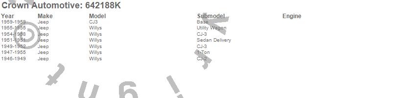 Crown Automotive is the premier manufacturer and distributor of quality replacement parts for Jeep® CJ™, Wrangler™, Cherokee™, Grand Cherokee™, Liberty™, and Commander™."From humble beginnings in 1963 in a small Boston storefront, Crown Automotive has consistently maintained its commitment to offering only quality parts and exceptional service. Today, with warehouses in Massachusetts, Georgia, Nevada, Spain, and the Czech Republic, totaling over 160,000 square feet, Crown Automotive continues to be the leader in quality replacement parts for Jeep® vehicles. With over 8,000 different parts in stock for Jeep® vehicles from 1942 on up, Crown has the largest stock of replacement parts for Jeep® vehicles, including factory-discontinued parts. In fact, many of the older Jeeps are still on (and off) the road thanks to Crown parts. The Crown line consists of axle, body, brake, clutch, cooling, driveline, electrical, engine, exhaust, fuel, steering, suspension, transmission and transfer case components. Crown Automotive also offers an exclusive line of component kits and accessory products. Because we know that Jeeps are driven harder than most other vehicles, we emphasize offering only quality parts. In fact, we test parts on Jeeps before distributing them to our dealers to insure that they meet our standards for quality. Crown also supports its entire line with a 12 month/12,000 mile warranty to insure our dealers and their customers of our commitment to offering quality parts. We know from experience that Jeep® owners would rather pay a little more for a good quality part that's backed by a strong guarantee. But we know that price is important as well. So, not only will you find Crown parts to be of exceptional quality, but you'll find them at a great price too.