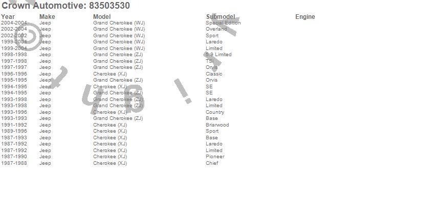 Cherokee (XJ), Grand Cherokee (WJ), Grand Cherokee (ZJ), Jeep, 2004, 2003, 2002, 2001, 2000, 1999, 1998, 1997, 1996, 1995, 1994, 1993, 1992, 1991, 1990, 1989 more…