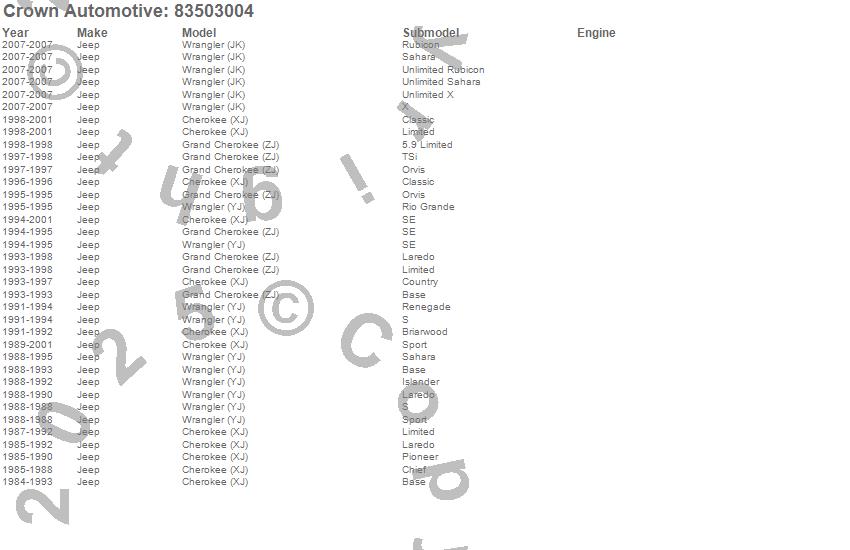 Crown Automotive is the premier manufacturer and distributor of quality replacement parts for Jeep® CJ™, Wrangler™, Cherokee™, Grand Cherokee™, Liberty™, and Commander™."From humble beginnings in 1963 in a small Boston storefront, Crown Automotive has consistently maintained its commitment to offering only quality parts and exceptional service. Today, with warehouses in Massachusetts, Georgia, Nevada, Spain, and the Czech Republic, totaling over 160,000 square feet, Crown Automotive continues to be the leader in quality replacement parts for Jeep® vehicles. With over 8,000 different parts in stock for Jeep® vehicles from 1942 on up, Crown has the largest stock of replacement parts for Jeep® vehicles, including factory-discontinued parts. In fact, many of the older Jeeps are still on (and off) the road thanks to Crown parts. The Crown line consists of axle, body, brake, clutch, cooling, driveline, electrical, engine, exhaust, fuel, steering, suspension, transmission and transfer case components. Crown Automotive also offers an exclusive line of component kits and accessory products. Because we know that Jeeps are driven harder than most other vehicles, we emphasize offering only quality parts. In fact, we test parts on Jeeps before distributing them to our dealers to insure that they meet our standards for quality. Crown also supports its entire line with a 12 month/12,000 mile warranty to insure our dealers and their customers of our commitment to offering quality parts. We know from experience that Jeep® owners would rather pay a little more for a good quality part that's backed by a strong guarantee. But we know that price is important as well. So, not only will you find Crown parts to be of exceptional quality, but you'll find them at a great price too.