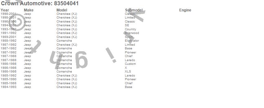 Cherokee (XJ), Comanche, Jeep, 2001, 2000, 1999, 1998, 1997, 1996, 1995, 1994, 1993, 1992, 1991, 1990, 1989, 1988, 1987, 1986, 1985 more…