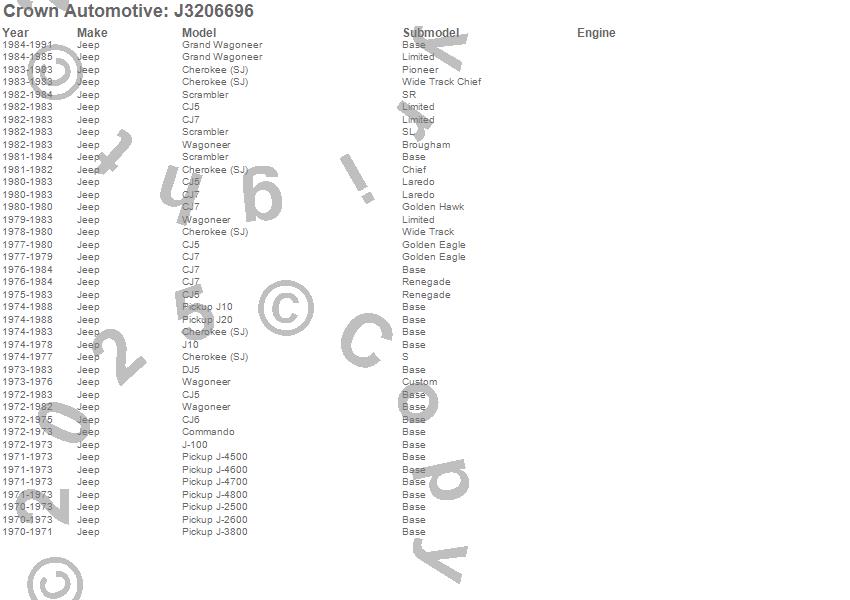Cherokee (SJ), CJ5, CJ6, CJ7, Commando, DJ5, DJ5C, DJ5F, Grand Wagoneer, J-100, J-2500, J-2600, J-3800, J-4500, J-4600, J-4700, J-4800, J10, J20, Jeepster more…