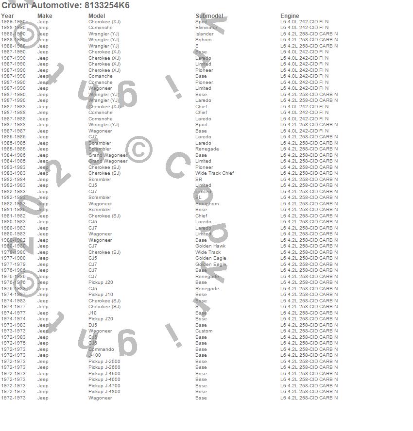 Cherokee (SJ), Cherokee (XJ), CJ5, CJ6, CJ7, Comanche, Commando, DJ5, DJ5C, DJ5F, Grand Wagoneer, J-100, J-2500, J-2600, J-4500, J-4600, J-4700, J-4800, J10, J20 more…