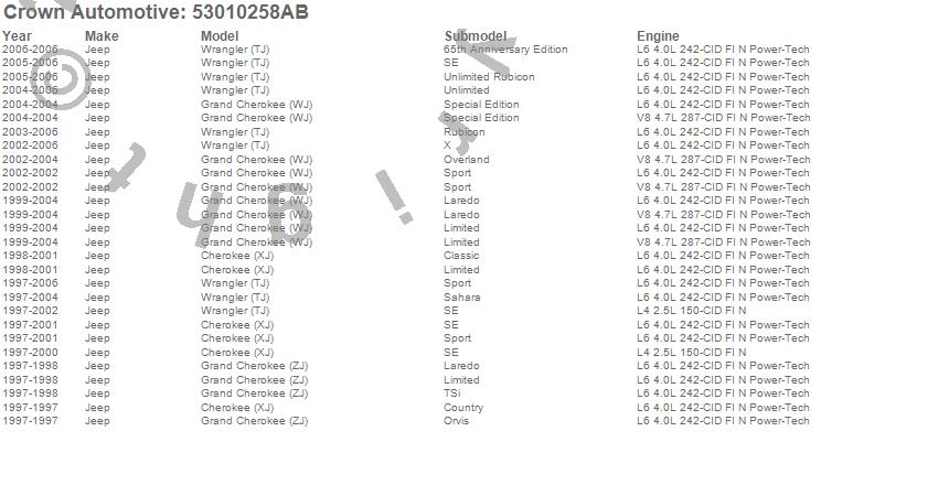 Cherokee (XJ), Grand Cherokee (WJ), Grand Cherokee (ZJ), Wrangler (LJ), Wrangler (TJ), Jeep, 2006, 2005, 2004, 2003, 2002, 2001, 2000, 1999, 1998, 1997 more…