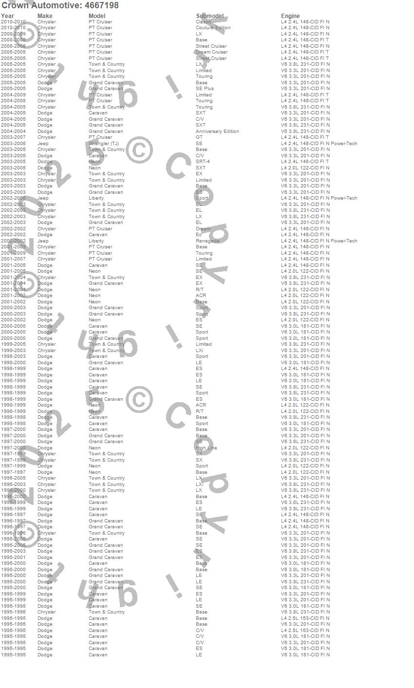 Caravan, Grand Caravan, Liberty, Neon, PT Cruiser, Town & Country, Wrangler (TJ), Chrysler, Dodge, Jeep, 2010, 2009, 2008, 2007, 2006, 2005, 2004, 2003, 2002, 2001 more…