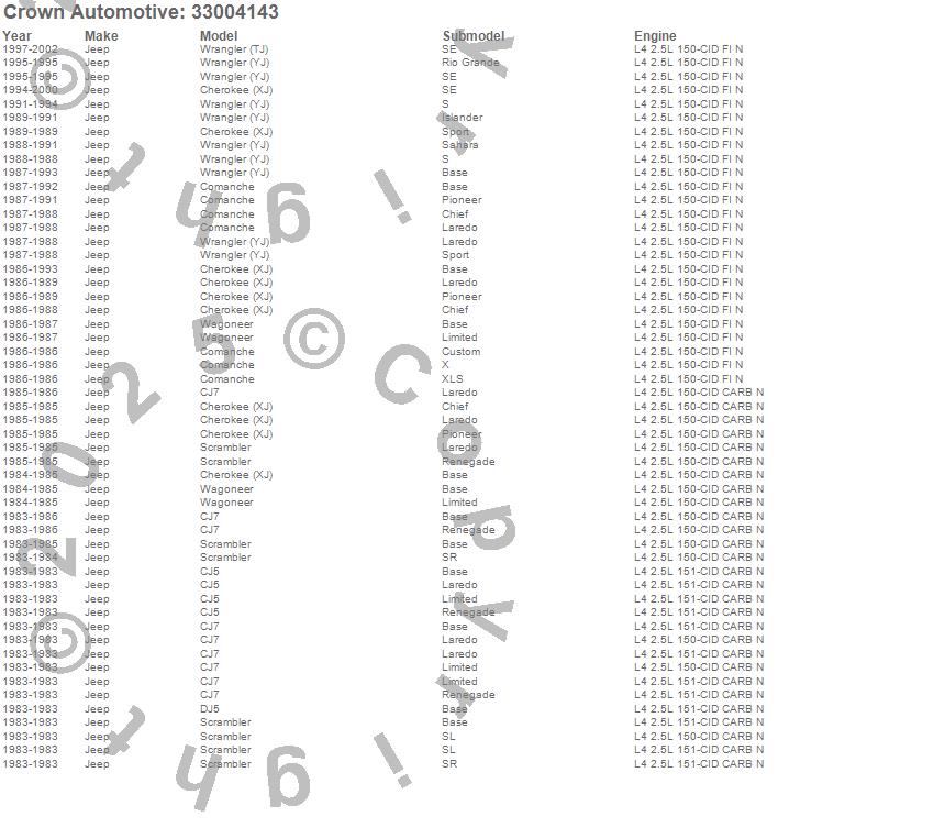 Crown Automotive is the premier manufacturer and distributor of quality replacement parts for Jeep® CJ™, Wrangler™, Cherokee™, Grand Cherokee™, Liberty™, and Commander™."From humble beginnings in 1963 in a small Boston storefront, Crown Automotive has consistently maintained its commitment to offering only quality parts and exceptional service. Today, with warehouses in Massachusetts, Georgia, Nevada, Spain, and the Czech Republic, totaling over 160,000 square feet, Crown Automotive continues to be the leader in quality replacement parts for Jeep® vehicles. With over 8,000 different parts in stock for Jeep® vehicles from 1942 on up, Crown has the largest stock of replacement parts for Jeep® vehicles, including factory-discontinued parts. In fact, many of the older Jeeps are still on (and off) the road thanks to Crown parts. The Crown line consists of axle, body, brake, clutch, cooling, driveline, electrical, engine, exhaust, fuel, steering, suspension, transmission and transfer case components. Crown Automotive also offers an exclusive line of component kits and accessory products. Because we know that Jeeps are driven harder than most other vehicles, we emphasize offering only quality parts. In fact, we test parts on Jeeps before distributing them to our dealers to insure that they meet our standards for quality. Crown also supports its entire line with a 12 month/12,000 mile warranty to insure our dealers and their customers of our commitment to offering quality parts. We know from experience that Jeep® owners would rather pay a little more for a good quality part that's backed by a strong guarantee. But we know that price is important as well. So, not only will you find Crown parts to be of exceptional quality, but you'll find them at a great price too.