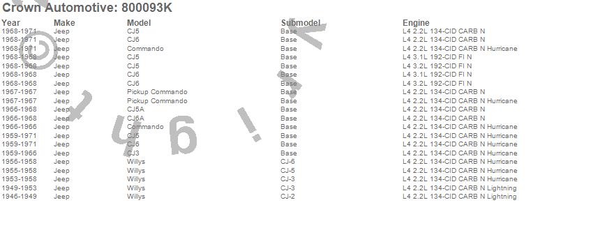 Crown Automotive is the premier manufacturer and distributor of quality replacement parts for Jeep® CJ™, Wrangler™, Cherokee™, Grand Cherokee™, Liberty™, and Commander™."From humble beginnings in 1963 in a small Boston storefront, Crown Automotive has consistently maintained its commitment to offering only quality parts and exceptional service. Today, with warehouses in Massachusetts, Georgia, Nevada, Spain, and the Czech Republic, totaling over 160,000 square feet, Crown Automotive continues to be the leader in quality replacement parts for Jeep® vehicles. With over 8,000 different parts in stock for Jeep® vehicles from 1942 on up, Crown has the largest stock of replacement parts for Jeep® vehicles, including factory-discontinued parts. In fact, many of the older Jeeps are still on (and off) the road thanks to Crown parts. The Crown line consists of axle, body, brake, clutch, cooling, driveline, electrical, engine, exhaust, fuel, steering, suspension, transmission and transfer case components. Crown Automotive also offers an exclusive line of component kits and accessory products. Because we know that Jeeps are driven harder than most other vehicles, we emphasize offering only quality parts. In fact, we test parts on Jeeps before distributing them to our dealers to insure that they meet our standards for quality. Crown also supports its entire line with a 12 month/12,000 mile warranty to insure our dealers and their customers of our commitment to offering quality parts. We know from experience that Jeep® owners would rather pay a little more for a good quality part that's backed by a strong guarantee. But we know that price is important as well. So, not only will you find Crown parts to be of exceptional quality, but you'll find them at a great price too.