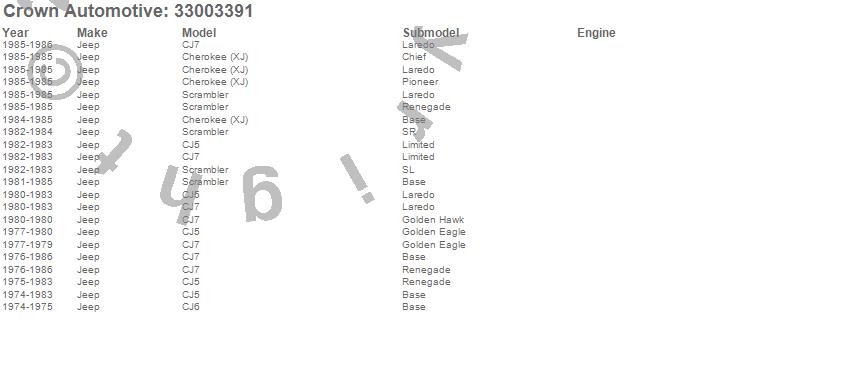 Crown Automotive is the premier manufacturer and distributor of quality replacement parts for Jeep® CJ™, Wrangler™, Cherokee™, Grand Cherokee™, Liberty™, and Commander™."From humble beginnings in 1963 in a small Boston storefront, Crown Automotive has consistently maintained its commitment to offering only quality parts and exceptional service. Today, with warehouses in Massachusetts, Georgia, Nevada, Spain, and the Czech Republic, totaling over 160,000 square feet, Crown Automotive continues to be the leader in quality replacement parts for Jeep® vehicles. With over 8,000 different parts in stock for Jeep® vehicles from 1942 on up, Crown has the largest stock of replacement parts for Jeep® vehicles, including factory-discontinued parts. In fact, many of the older Jeeps are still on (and off) the road thanks to Crown parts. The Crown line consists of axle, body, brake, clutch, cooling, driveline, electrical, engine, exhaust, fuel, steering, suspension, transmission and transfer case components. Crown Automotive also offers an exclusive line of component kits and accessory products. Because we know that Jeeps are driven harder than most other vehicles, we emphasize offering only quality parts. In fact, we test parts on Jeeps before distributing them to our dealers to insure that they meet our standards for quality. Crown also supports its entire line with a 12 month/12,000 mile warranty to insure our dealers and their customers of our commitment to offering quality parts. We know from experience that Jeep® owners would rather pay a little more for a good quality part that's backed by a strong guarantee. But we know that price is important as well. So, not only will you find Crown parts to be of exceptional quality, but you'll find them at a great price too.
