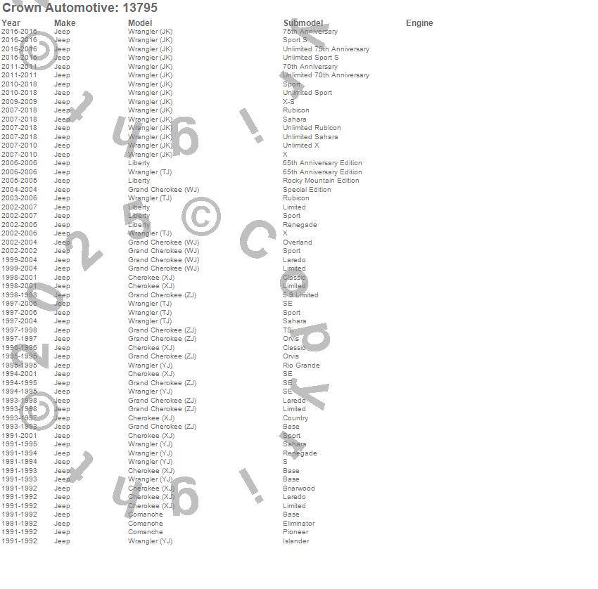 Crown Automotive is the premier manufacturer and distributor of quality replacement parts for Jeep® CJ™, Wrangler™, Cherokee™, Grand Cherokee™, Liberty™, and Commander™."From humble beginnings in 1963 in a small Boston storefront, Crown Automotive has consistently maintained its commitment to offering only quality parts and exceptional service. Today, with warehouses in Massachusetts, Georgia, Nevada, Spain, and the Czech Republic, totaling over 160,000 square feet, Crown Automotive continues to be the leader in quality replacement parts for Jeep® vehicles. With over 8,000 different parts in stock for Jeep® vehicles from 1942 on up, Crown has the largest stock of replacement parts for Jeep® vehicles, including factory-discontinued parts. In fact, many of the older Jeeps are still on (and off) the road thanks to Crown parts. The Crown line consists of axle, body, brake, clutch, cooling, driveline, electrical, engine, exhaust, fuel, steering, suspension, transmission and transfer case components. Crown Automotive also offers an exclusive line of component kits and accessory products. Because we know that Jeeps are driven harder than most other vehicles, we emphasize offering only quality parts. In fact, we test parts on Jeeps before distributing them to our dealers to insure that they meet our standards for quality. Crown also supports its entire line with a 12 month/12,000 mile warranty to insure our dealers and their customers of our commitment to offering quality parts. We know from experience that Jeep® owners would rather pay a little more for a good quality part that's backed by a strong guarantee. But we know that price is important as well. So, not only will you find Crown parts to be of exceptional quality, but you'll find them at a great price too.