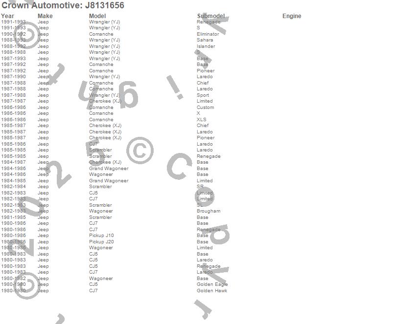 Cherokee (XJ), CJ5, CJ7, Comanche, Grand Wagoneer, J10, J20, Scrambler, Wagoneer, Wrangler (YJ), Jeep, 1993, 1992, 1991, 1990, 1989, 1988, 1987, 1986, 1985 more…