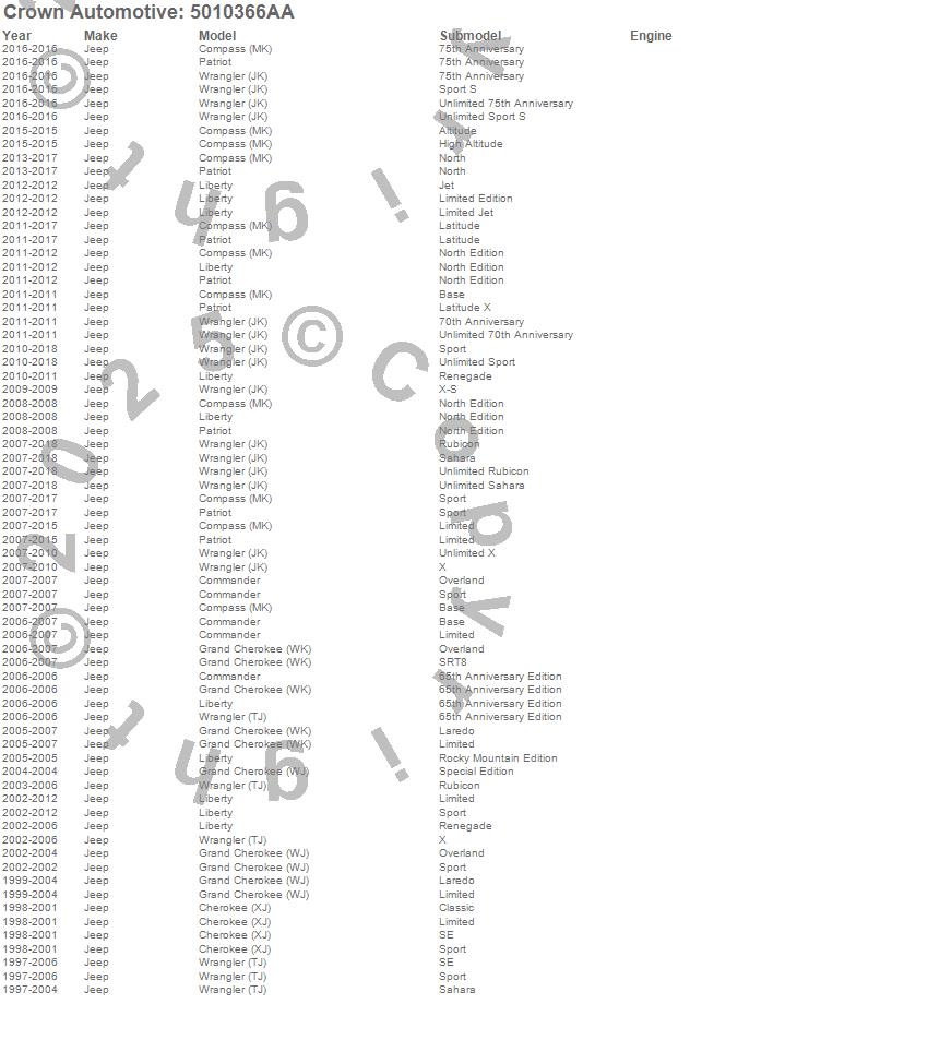 Crown Automotive is the premier manufacturer and distributor of quality replacement parts for Jeep® CJ™, Wrangler™, Cherokee™, Grand Cherokee™, Liberty™, and Commander™."From humble beginnings in 1963 in a small Boston storefront, Crown Automotive has consistently maintained its commitment to offering only quality parts and exceptional service. Today, with warehouses in Massachusetts, Georgia, Nevada, Spain, and the Czech Republic, totaling over 160,000 square feet, Crown Automotive continues to be the leader in quality replacement parts for Jeep® vehicles. With over 8,000 different parts in stock for Jeep® vehicles from 1942 on up, Crown has the largest stock of replacement parts for Jeep® vehicles, including factory-discontinued parts. In fact, many of the older Jeeps are still on (and off) the road thanks to Crown parts. The Crown line consists of axle, body, brake, clutch, cooling, driveline, electrical, engine, exhaust, fuel, steering, suspension, transmission and transfer case components. Crown Automotive also offers an exclusive line of component kits and accessory products. Because we know that Jeeps are driven harder than most other vehicles, we emphasize offering only quality parts. In fact, we test parts on Jeeps before distributing them to our dealers to insure that they meet our standards for quality. Crown also supports its entire line with a 12 month/12,000 mile warranty to insure our dealers and their customers of our commitment to offering quality parts. We know from experience that Jeep® owners would rather pay a little more for a good quality part that's backed by a strong guarantee. But we know that price is important as well. So, not only will you find Crown parts to be of exceptional quality, but you'll find them at a great price too.