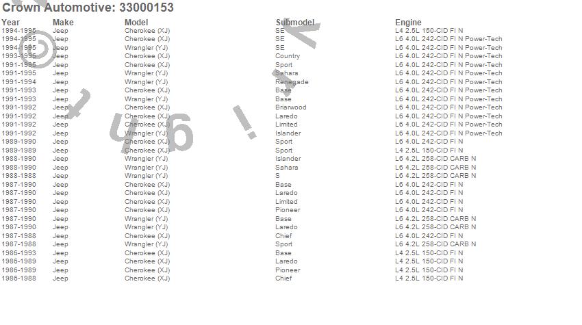 Crown Automotive is the premier manufacturer and distributor of quality replacement parts for Jeep® CJ™, Wrangler™, Cherokee™, Grand Cherokee™, Liberty™, and Commander™."From humble beginnings in 1963 in a small Boston storefront, Crown Automotive has consistently maintained its commitment to offering only quality parts and exceptional service. Today, with warehouses in Massachusetts, Georgia, Nevada, Spain, and the Czech Republic, totaling over 160,000 square feet, Crown Automotive continues to be the leader in quality replacement parts for Jeep® vehicles. With over 8,000 different parts in stock for Jeep® vehicles from 1942 on up, Crown has the largest stock of replacement parts for Jeep® vehicles, including factory-discontinued parts. In fact, many of the older Jeeps are still on (and off) the road thanks to Crown parts. The Crown line consists of axle, body, brake, clutch, cooling, driveline, electrical, engine, exhaust, fuel, steering, suspension, transmission and transfer case components. Crown Automotive also offers an exclusive line of component kits and accessory products. Because we know that Jeeps are driven harder than most other vehicles, we emphasize offering only quality parts. In fact, we test parts on Jeeps before distributing them to our dealers to insure that they meet our standards for quality. Crown also supports its entire line with a 12 month/12,000 mile warranty to insure our dealers and their customers of our commitment to offering quality parts. We know from experience that Jeep® owners would rather pay a little more for a good quality part that's backed by a strong guarantee. But we know that price is important as well. So, not only will you find Crown parts to be of exceptional quality, but you'll find them at a great price too.