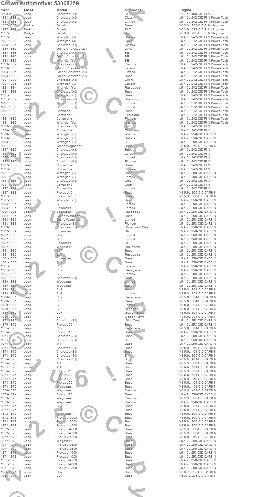 Cherokee (SJ), Cherokee (XJ), CJ5, CJ6, CJ7, Comanche, Dakota, Grand Cherokee (ZJ), Grand Wagoneer, J-2500, J-2600, J-3800, J-4500, J-4600, J-4700, J-4800, J10, J20, Scrambler, Wagoneer more…