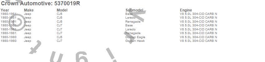 Crown Automotive is the premier manufacturer and distributor of quality replacement parts for Jeep® CJ™, Wrangler™, Cherokee™, Grand Cherokee™, Liberty™, and Commander™."From humble beginnings in 1963 in a small Boston storefront, Crown Automotive has consistently maintained its commitment to offering only quality parts and exceptional service. Today, with warehouses in Massachusetts, Georgia, Nevada, Spain, and the Czech Republic, totaling over 160,000 square feet, Crown Automotive continues to be the leader in quality replacement parts for Jeep® vehicles. With over 8,000 different parts in stock for Jeep® vehicles from 1942 on up, Crown has the largest stock of replacement parts for Jeep® vehicles, including factory-discontinued parts. In fact, many of the older Jeeps are still on (and off) the road thanks to Crown parts. The Crown line consists of axle, body, brake, clutch, cooling, driveline, electrical, engine, exhaust, fuel, steering, suspension, transmission and transfer case components. Crown Automotive also offers an exclusive line of component kits and accessory products. Because we know that Jeeps are driven harder than most other vehicles, we emphasize offering only quality parts. In fact, we test parts on Jeeps before distributing them to our dealers to insure that they meet our standards for quality. Crown also supports its entire line with a 12 month/12,000 mile warranty to insure our dealers and their customers of our commitment to offering quality parts. We know from experience that Jeep® owners would rather pay a little more for a good quality part that's backed by a strong guarantee. But we know that price is important as well. So, not only will you find Crown parts to be of exceptional quality, but you'll find them at a great price too.