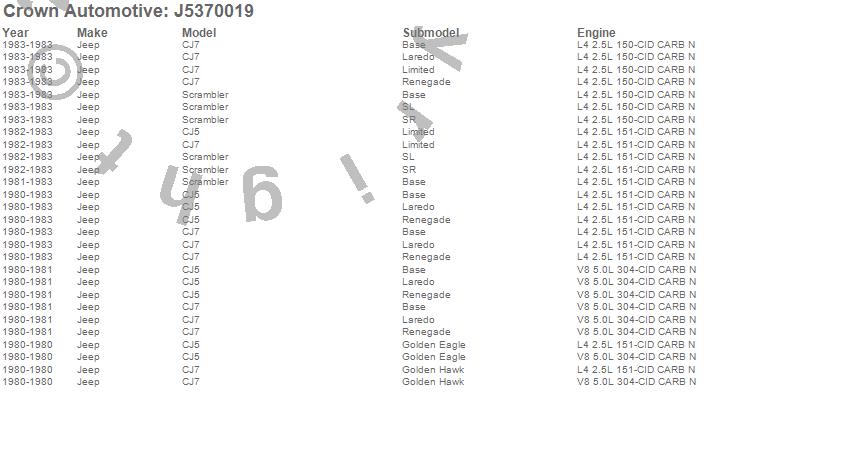 Crown Automotive is the premier manufacturer and distributor of quality replacement parts for Jeep® CJ™, Wrangler™, Cherokee™, Grand Cherokee™, Liberty™, and Commander™."From humble beginnings in 1963 in a small Boston storefront, Crown Automotive has consistently maintained its commitment to offering only quality parts and exceptional service. Today, with warehouses in Massachusetts, Georgia, Nevada, Spain, and the Czech Republic, totaling over 160,000 square feet, Crown Automotive continues to be the leader in quality replacement parts for Jeep® vehicles. With over 8,000 different parts in stock for Jeep® vehicles from 1942 on up, Crown has the largest stock of replacement parts for Jeep® vehicles, including factory-discontinued parts. In fact, many of the older Jeeps are still on (and off) the road thanks to Crown parts. The Crown line consists of axle, body, brake, clutch, cooling, driveline, electrical, engine, exhaust, fuel, steering, suspension, transmission and transfer case components. Crown Automotive also offers an exclusive line of component kits and accessory products. Because we know that Jeeps are driven harder than most other vehicles, we emphasize offering only quality parts. In fact, we test parts on Jeeps before distributing them to our dealers to insure that they meet our standards for quality. Crown also supports its entire line with a 12 month/12,000 mile warranty to insure our dealers and their customers of our commitment to offering quality parts. We know from experience that Jeep® owners would rather pay a little more for a good quality part that's backed by a strong guarantee. But we know that price is important as well. So, not only will you find Crown parts to be of exceptional quality, but you'll find them at a great price too.