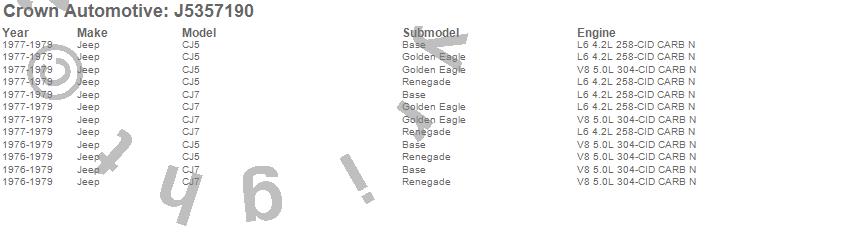 Crown Automotive is the premier manufacturer and distributor of quality replacement parts for Jeep® CJ™, Wrangler™, Cherokee™, Grand Cherokee™, Liberty™, and Commander™."From humble beginnings in 1963 in a small Boston storefront, Crown Automotive has consistently maintained its commitment to offering only quality parts and exceptional service. Today, with warehouses in Massachusetts, Georgia, Nevada, Spain, and the Czech Republic, totaling over 160,000 square feet, Crown Automotive continues to be the leader in quality replacement parts for Jeep® vehicles. With over 8,000 different parts in stock for Jeep® vehicles from 1942 on up, Crown has the largest stock of replacement parts for Jeep® vehicles, including factory-discontinued parts. In fact, many of the older Jeeps are still on (and off) the road thanks to Crown parts. The Crown line consists of axle, body, brake, clutch, cooling, driveline, electrical, engine, exhaust, fuel, steering, suspension, transmission and transfer case components. Crown Automotive also offers an exclusive line of component kits and accessory products. Because we know that Jeeps are driven harder than most other vehicles, we emphasize offering only quality parts. In fact, we test parts on Jeeps before distributing them to our dealers to insure that they meet our standards for quality. Crown also supports its entire line with a 12 month/12,000 mile warranty to insure our dealers and their customers of our commitment to offering quality parts. We know from experience that Jeep® owners would rather pay a little more for a good quality part that's backed by a strong guarantee. But we know that price is important as well. So, not only will you find Crown parts to be of exceptional quality, but you'll find them at a great price too.