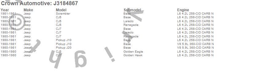 Crown Automotive is the premier manufacturer and distributor of quality replacement parts for Jeep® CJ™, Wrangler™, Cherokee™, Grand Cherokee™, Liberty™, and Commander™."From humble beginnings in 1963 in a small Boston storefront, Crown Automotive has consistently maintained its commitment to offering only quality parts and exceptional service. Today, with warehouses in Massachusetts, Georgia, Nevada, Spain, and the Czech Republic, totaling over 160,000 square feet, Crown Automotive continues to be the leader in quality replacement parts for Jeep® vehicles. With over 8,000 different parts in stock for Jeep® vehicles from 1942 on up, Crown has the largest stock of replacement parts for Jeep® vehicles, including factory-discontinued parts. In fact, many of the older Jeeps are still on (and off) the road thanks to Crown parts. The Crown line consists of axle, body, brake, clutch, cooling, driveline, electrical, engine, exhaust, fuel, steering, suspension, transmission and transfer case components. Crown Automotive also offers an exclusive line of component kits and accessory products. Because we know that Jeeps are driven harder than most other vehicles, we emphasize offering only quality parts. In fact, we test parts on Jeeps before distributing them to our dealers to insure that they meet our standards for quality. Crown also supports its entire line with a 12 month/12,000 mile warranty to insure our dealers and their customers of our commitment to offering quality parts. We know from experience that Jeep® owners would rather pay a little more for a good quality part that's backed by a strong guarantee. But we know that price is important as well. So, not only will you find Crown parts to be of exceptional quality, but you'll find them at a great price too.