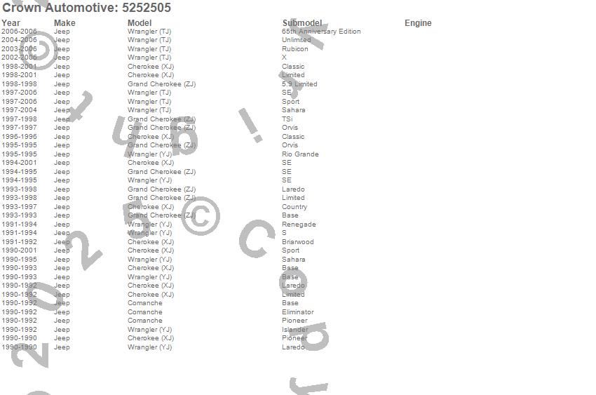 Crown Automotive is the premier manufacturer and distributor of quality replacement parts for Jeep® CJ™, Wrangler™, Cherokee™, Grand Cherokee™, Liberty™, and Commander™."From humble beginnings in 1963 in a small Boston storefront, Crown Automotive has consistently maintained its commitment to offering only quality parts and exceptional service. Today, with warehouses in Massachusetts, Georgia, Nevada, Spain, and the Czech Republic, totaling over 160,000 square feet, Crown Automotive continues to be the leader in quality replacement parts for Jeep® vehicles. With over 8,000 different parts in stock for Jeep® vehicles from 1942 on up, Crown has the largest stock of replacement parts for Jeep® vehicles, including factory-discontinued parts. In fact, many of the older Jeeps are still on (and off) the road thanks to Crown parts. The Crown line consists of axle, body, brake, clutch, cooling, driveline, electrical, engine, exhaust, fuel, steering, suspension, transmission and transfer case components. Crown Automotive also offers an exclusive line of component kits and accessory products. Because we know that Jeeps are driven harder than most other vehicles, we emphasize offering only quality parts. In fact, we test parts on Jeeps before distributing them to our dealers to insure that they meet our standards for quality. Crown also supports its entire line with a 12 month/12,000 mile warranty to insure our dealers and their customers of our commitment to offering quality parts. We know from experience that Jeep® owners would rather pay a little more for a good quality part that's backed by a strong guarantee. But we know that price is important as well. So, not only will you find Crown parts to be of exceptional quality, but you'll find them at a great price too.