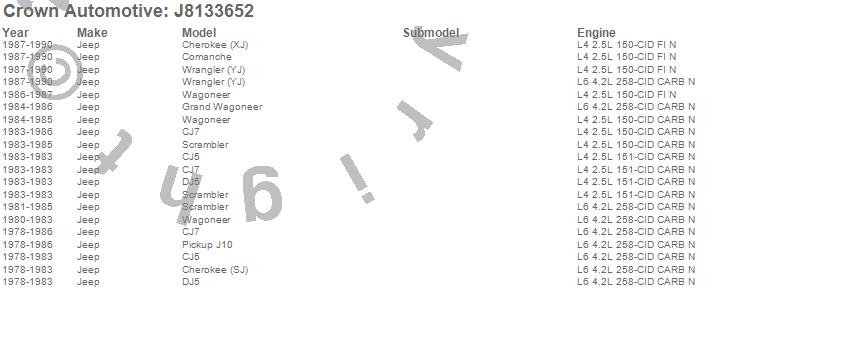 Crown Automotive is the premier manufacturer and distributor of quality replacement parts for Jeep® CJ™, Wrangler™, Cherokee™, Grand Cherokee™, Liberty™, and Commander™."From humble beginnings in 1963 in a small Boston storefront, Crown Automotive has consistently maintained its commitment to offering only quality parts and exceptional service. Today, with warehouses in Massachusetts, Georgia, Nevada, Spain, and the Czech Republic, totaling over 160,000 square feet, Crown Automotive continues to be the leader in quality replacement parts for Jeep® vehicles. With over 8,000 different parts in stock for Jeep® vehicles from 1942 on up, Crown has the largest stock of replacement parts for Jeep® vehicles, including factory-discontinued parts. In fact, many of the older Jeeps are still on (and off) the road thanks to Crown parts. The Crown line consists of axle, body, brake, clutch, cooling, driveline, electrical, engine, exhaust, fuel, steering, suspension, transmission and transfer case components. Crown Automotive also offers an exclusive line of component kits and accessory products. Because we know that Jeeps are driven harder than most other vehicles, we emphasize offering only quality parts. In fact, we test parts on Jeeps before distributing them to our dealers to insure that they meet our standards for quality. Crown also supports its entire line with a 12 month/12,000 mile warranty to insure our dealers and their customers of our commitment to offering quality parts. We know from experience that Jeep® owners would rather pay a little more for a good quality part that's backed by a strong guarantee. But we know that price is important as well. So, not only will you find Crown parts to be of exceptional quality, but you'll find them at a great price too.