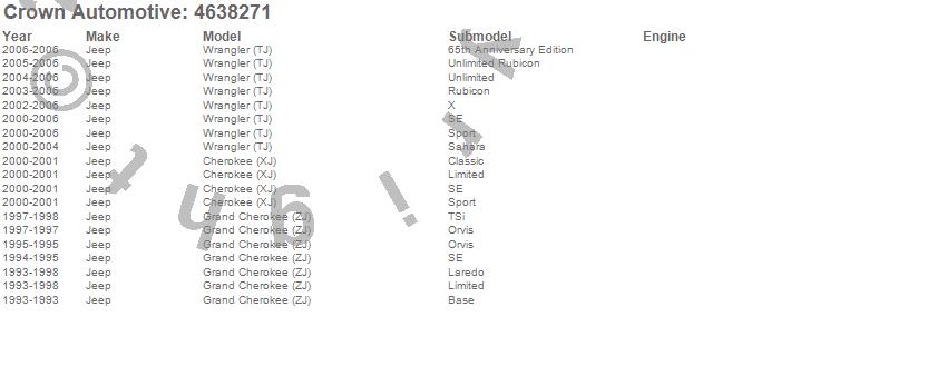 Crown Automotive is the premier manufacturer and distributor of quality replacement parts for Jeep® CJ™, Wrangler™, Cherokee™, Grand Cherokee™, Liberty™, and Commander™."From humble beginnings in 1963 in a small Boston storefront, Crown Automotive has consistently maintained its commitment to offering only quality parts and exceptional service. Today, with warehouses in Massachusetts, Georgia, Nevada, Spain, and the Czech Republic, totaling over 160,000 square feet, Crown Automotive continues to be the leader in quality replacement parts for Jeep® vehicles. With over 8,000 different parts in stock for Jeep® vehicles from 1942 on up, Crown has the largest stock of replacement parts for Jeep® vehicles, including factory-discontinued parts. In fact, many of the older Jeeps are still on (and off) the road thanks to Crown parts. The Crown line consists of axle, body, brake, clutch, cooling, driveline, electrical, engine, exhaust, fuel, steering, suspension, transmission and transfer case components. Crown Automotive also offers an exclusive line of component kits and accessory products. Because we know that Jeeps are driven harder than most other vehicles, we emphasize offering only quality parts. In fact, we test parts on Jeeps before distributing them to our dealers to insure that they meet our standards for quality. Crown also supports its entire line with a 12 month/12,000 mile warranty to insure our dealers and their customers of our commitment to offering quality parts. We know from experience that Jeep® owners would rather pay a little more for a good quality part that's backed by a strong guarantee. But we know that price is important as well. So, not only will you find Crown parts to be of exceptional quality, but you'll find them at a great price too.