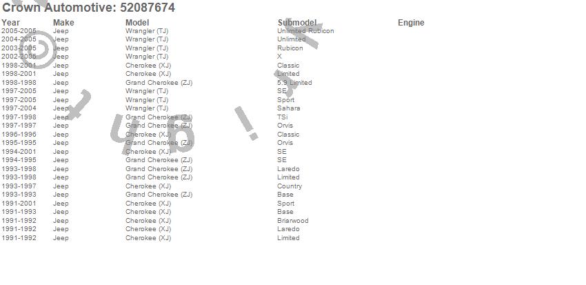 Crown Automotive is the premier manufacturer and distributor of quality replacement parts for Jeep® CJ™, Wrangler™, Cherokee™, Grand Cherokee™, Liberty™, and Commander™."From humble beginnings in 1963 in a small Boston storefront, Crown Automotive has consistently maintained its commitment to offering only quality parts and exceptional service. Today, with warehouses in Massachusetts, Georgia, Nevada, Spain, and the Czech Republic, totaling over 160,000 square feet, Crown Automotive continues to be the leader in quality replacement parts for Jeep® vehicles. With over 8,000 different parts in stock for Jeep® vehicles from 1942 on up, Crown has the largest stock of replacement parts for Jeep® vehicles, including factory-discontinued parts. In fact, many of the older Jeeps are still on (and off) the road thanks to Crown parts. The Crown line consists of axle, body, brake, clutch, cooling, driveline, electrical, engine, exhaust, fuel, steering, suspension, transmission and transfer case components. Crown Automotive also offers an exclusive line of component kits and accessory products. Because we know that Jeeps are driven harder than most other vehicles, we emphasize offering only quality parts. In fact, we test parts on Jeeps before distributing them to our dealers to insure that they meet our standards for quality. Crown also supports its entire line with a 12 month/12,000 mile warranty to insure our dealers and their customers of our commitment to offering quality parts. We know from experience that Jeep® owners would rather pay a little more for a good quality part that's backed by a strong guarantee. But we know that price is important as well. So, not only will you find Crown parts to be of exceptional quality, but you'll find them at a great price too.