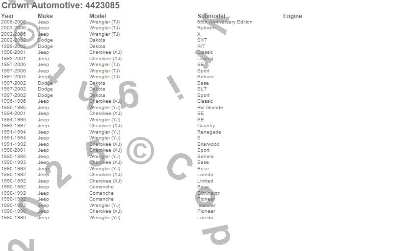 Cherokee (XJ), Comanche, Dakota, Wrangler (TJ), Wrangler (YJ), Dodge, Jeep, 2006, 2005, 2004, 2003, 2002, 2001, 2000, 1999, 1998, 1997, 1996, 1995, 1994 more…