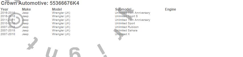 Crown Automotive is the premier manufacturer and distributor of quality replacement parts for Jeep® CJ™, Wrangler™, Cherokee™, Grand Cherokee™, Liberty™, and Commander™."From humble beginnings in 1963 in a small Boston storefront, Crown Automotive has consistently maintained its commitment to offering only quality parts and exceptional service. Today, with warehouses in Massachusetts, Georgia, Nevada, Spain, and the Czech Republic, totaling over 160,000 square feet, Crown Automotive continues to be the leader in quality replacement parts for Jeep® vehicles. With over 8,000 different parts in stock for Jeep® vehicles from 1942 on up, Crown has the largest stock of replacement parts for Jeep® vehicles, including factory-discontinued parts. In fact, many of the older Jeeps are still on (and off) the road thanks to Crown parts. The Crown line consists of axle, body, brake, clutch, cooling, driveline, electrical, engine, exhaust, fuel, steering, suspension, transmission and transfer case components. Crown Automotive also offers an exclusive line of component kits and accessory products. Because we know that Jeeps are driven harder than most other vehicles, we emphasize offering only quality parts. In fact, we test parts on Jeeps before distributing them to our dealers to insure that they meet our standards for quality. Crown also supports its entire line with a 12 month/12,000 mile warranty to insure our dealers and their customers of our commitment to offering quality parts. We know from experience that Jeep® owners would rather pay a little more for a good quality part that's backed by a strong guarantee. But we know that price is important as well. So, not only will you find Crown parts to be of exceptional quality, but you'll find them at a great price too.