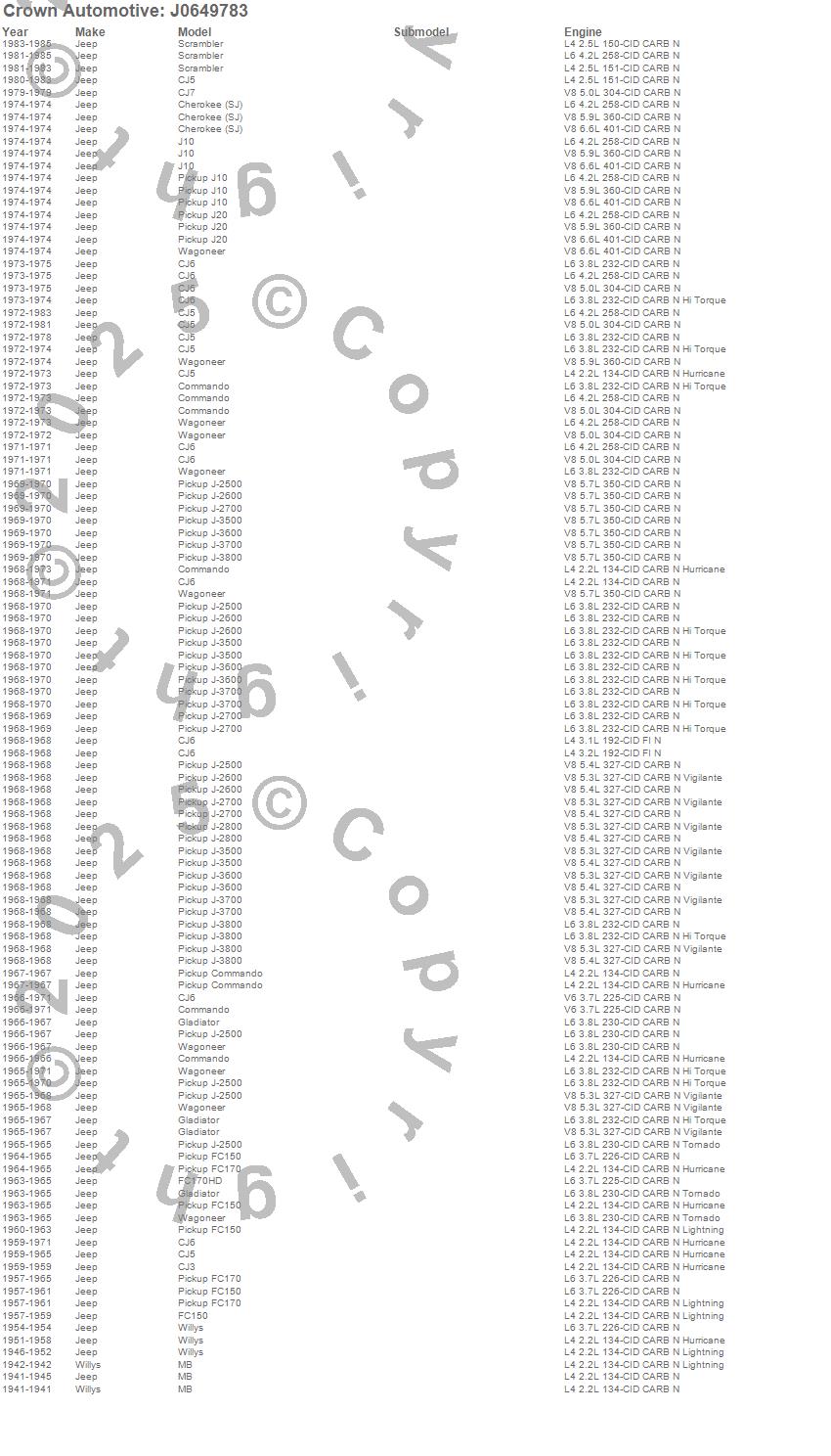 1-Ton Pickup, Cherokee (SJ), CJ-2A, CJ-3A, CJ-3B, CJ5, CJ6, Commando, FC150, FC170, FC170HD, Gladiator, J-2500, J-2600, J-2700, J-2800, J-3500, J-3600, J-3700, J-3800 more…