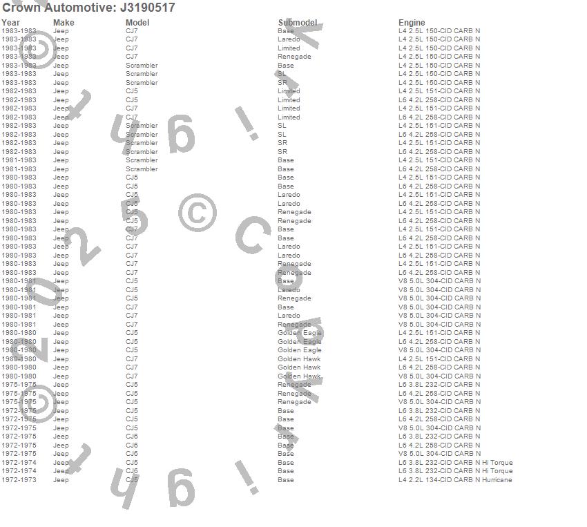 Crown Automotive is the premier manufacturer and distributor of quality replacement parts for Jeep® CJ™, Wrangler™, Cherokee™, Grand Cherokee™, Liberty™, and Commander™."From humble beginnings in 1963 in a small Boston storefront, Crown Automotive has consistently maintained its commitment to offering only quality parts and exceptional service. Today, with warehouses in Massachusetts, Georgia, Nevada, Spain, and the Czech Republic, totaling over 160,000 square feet, Crown Automotive continues to be the leader in quality replacement parts for Jeep® vehicles. With over 8,000 different parts in stock for Jeep® vehicles from 1942 on up, Crown has the largest stock of replacement parts for Jeep® vehicles, including factory-discontinued parts. In fact, many of the older Jeeps are still on (and off) the road thanks to Crown parts. The Crown line consists of axle, body, brake, clutch, cooling, driveline, electrical, engine, exhaust, fuel, steering, suspension, transmission and transfer case components. Crown Automotive also offers an exclusive line of component kits and accessory products. Because we know that Jeeps are driven harder than most other vehicles, we emphasize offering only quality parts. In fact, we test parts on Jeeps before distributing them to our dealers to insure that they meet our standards for quality. Crown also supports its entire line with a 12 month/12,000 mile warranty to insure our dealers and their customers of our commitment to offering quality parts. We know from experience that Jeep® owners would rather pay a little more for a good quality part that's backed by a strong guarantee. But we know that price is important as well. So, not only will you find Crown parts to be of exceptional quality, but you'll find them at a great price too.