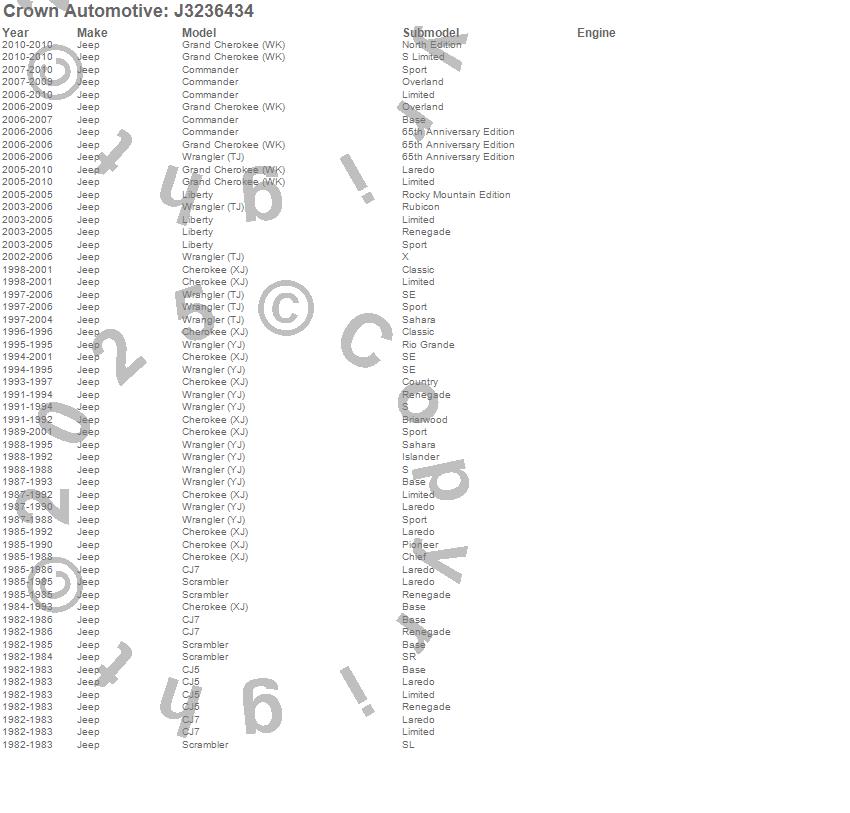 Crown Automotive is the premier manufacturer and distributor of quality replacement parts for Jeep® CJ™, Wrangler™, Cherokee™, Grand Cherokee™, Liberty™, and Commander™."From humble beginnings in 1963 in a small Boston storefront, Crown Automotive has consistently maintained its commitment to offering only quality parts and exceptional service. Today, with warehouses in Massachusetts, Georgia, Nevada, Spain, and the Czech Republic, totaling over 160,000 square feet, Crown Automotive continues to be the leader in quality replacement parts for Jeep® vehicles. With over 8,000 different parts in stock for Jeep® vehicles from 1942 on up, Crown has the largest stock of replacement parts for Jeep® vehicles, including factory-discontinued parts. In fact, many of the older Jeeps are still on (and off) the road thanks to Crown parts. The Crown line consists of axle, body, brake, clutch, cooling, driveline, electrical, engine, exhaust, fuel, steering, suspension, transmission and transfer case components. Crown Automotive also offers an exclusive line of component kits and accessory products. Because we know that Jeeps are driven harder than most other vehicles, we emphasize offering only quality parts. In fact, we test parts on Jeeps before distributing them to our dealers to insure that they meet our standards for quality. Crown also supports its entire line with a 12 month/12,000 mile warranty to insure our dealers and their customers of our commitment to offering quality parts. We know from experience that Jeep® owners would rather pay a little more for a good quality part that's backed by a strong guarantee. But we know that price is important as well. So, not only will you find Crown parts to be of exceptional quality, but you'll find them at a great price too.