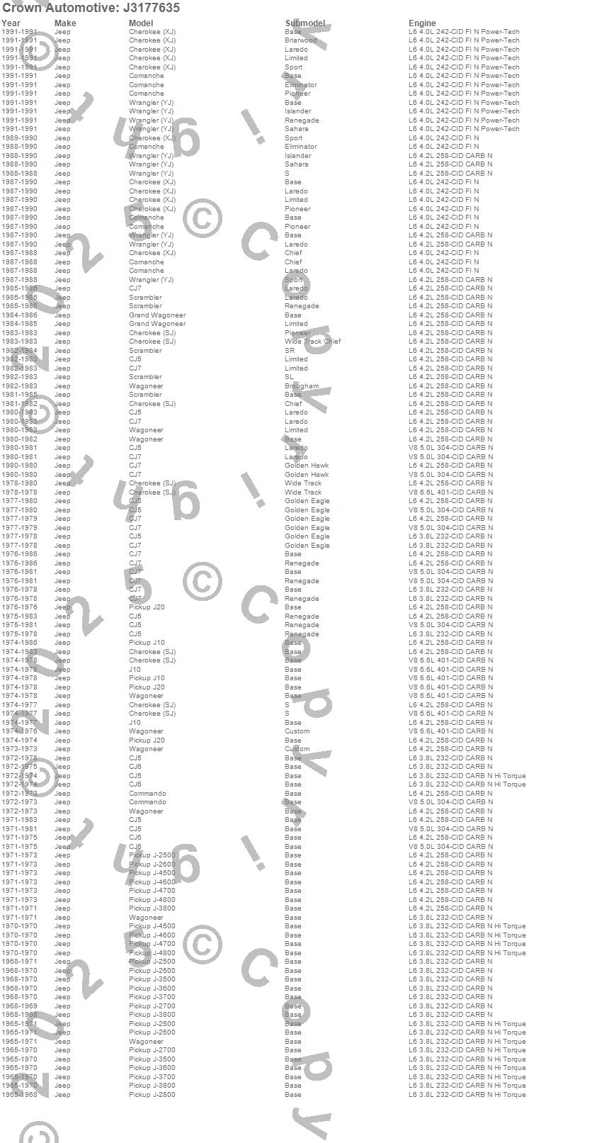 Cherokee (SJ), Cherokee (XJ), CJ5, CJ6, CJ7, Comanche, Commando, Grand Wagoneer, J-2500, J-2600, J-2700, J-2800, J-3500, J-3600, J-3700, J-3800, J-4500, J-4600, J-4700, J-4800 more…
