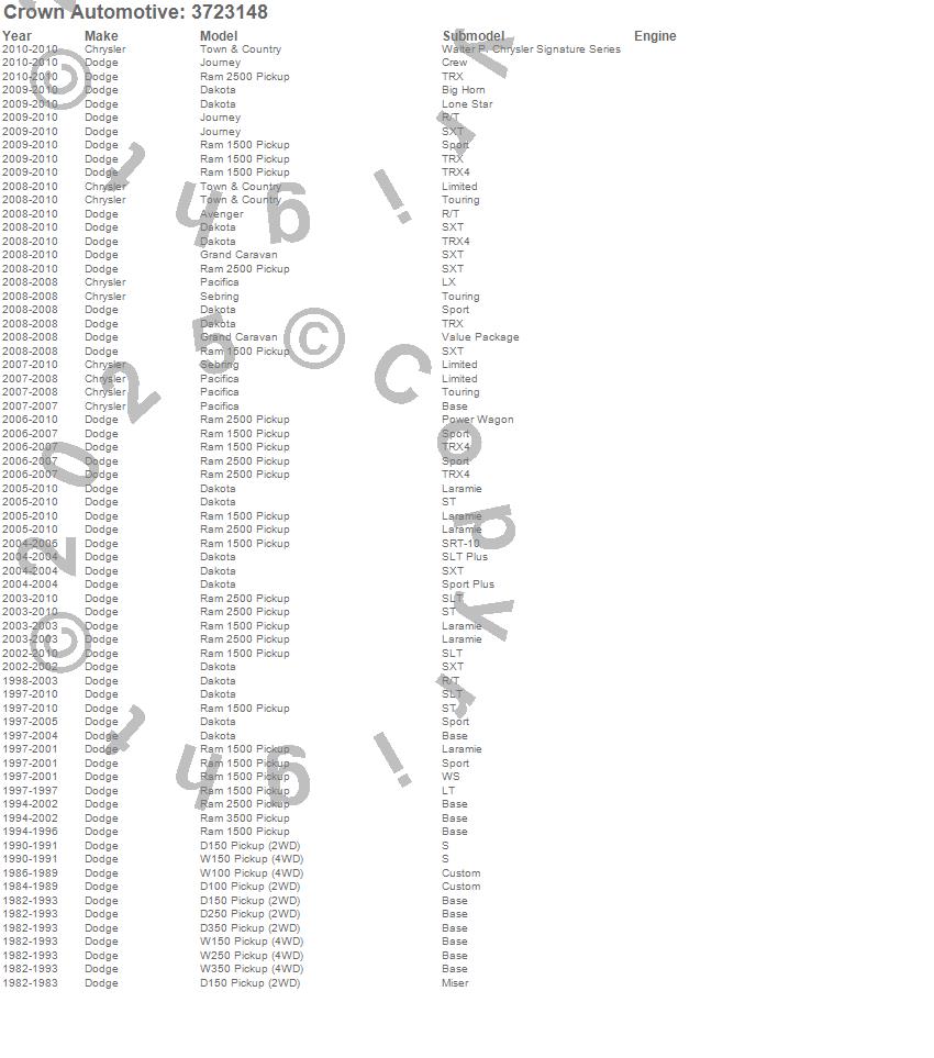 Avenger, D100 Pickup, D150 Pickup, D250 Pickup, D350 Pickup, Dakota, Grand Caravan, Journey, Pacifica, Ram 1500, Ram 2500, Ram 3500, Sebring, Town & Country, W100 Pickup, W150 Pickup, W250 Pickup, W350 Pickup, Chrysler, Dodge more…